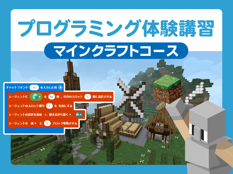 子供たちに大人気のゲーム、マインクラフトを使ったプログラミング講習です。いつものゲームで慣れ親しんだキャラクターを自分の作ったプログラムで動かすなど子供たちにも理解しやすく始めやすい内容となっています。